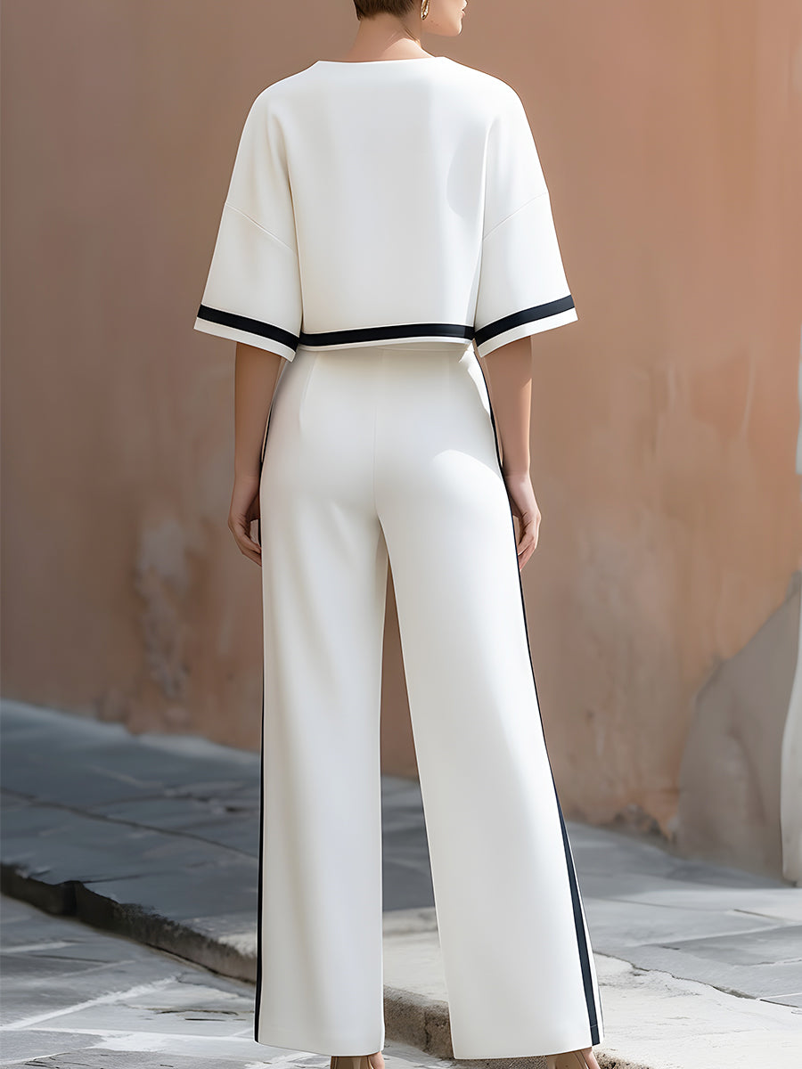 Perfect for elevating your casual-chic wardrobe or making a sharp style statement, this set marries minimalist design with striking contrast. The wrinkle-resistant fabric offers all-day comfort, while the wide-leg pants create a flattering, elongated silhouette. Style it with strappy block heels and a mini metallic clutch for an elevated evening look, or pair with white sneakers for a fresh, casual daytime vibe that transitions seamlessly from coffee runs to city walks.